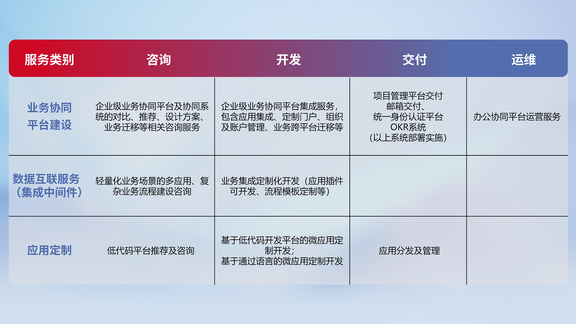 针对钉钉、、、、企微、、IDaas等平台级产品提供产品的规划、、、方案、、交付、、定制化开发等服务,,,,实现如统一协同办公、、、智能客户服务、、、、混合会议管理、、、智能数据查询、、、等业务场景,,,实现数字化转型。。